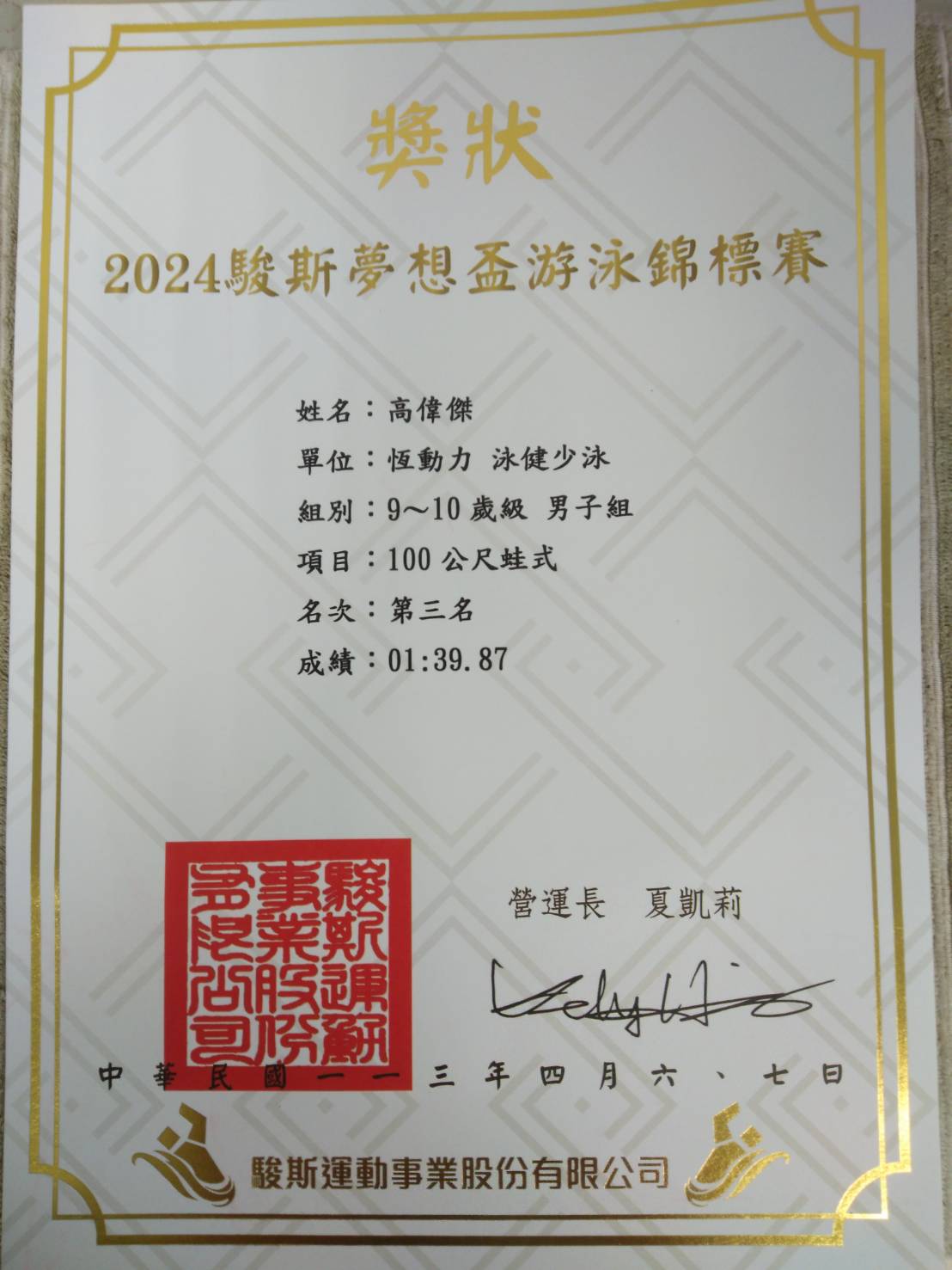 2024駿斯夢想盃游泳錦標賽--恭喜3年9班高偉傑榮獲9-10歲級男子組100公尺蛙式第3名 、50公尺蝶式第4名