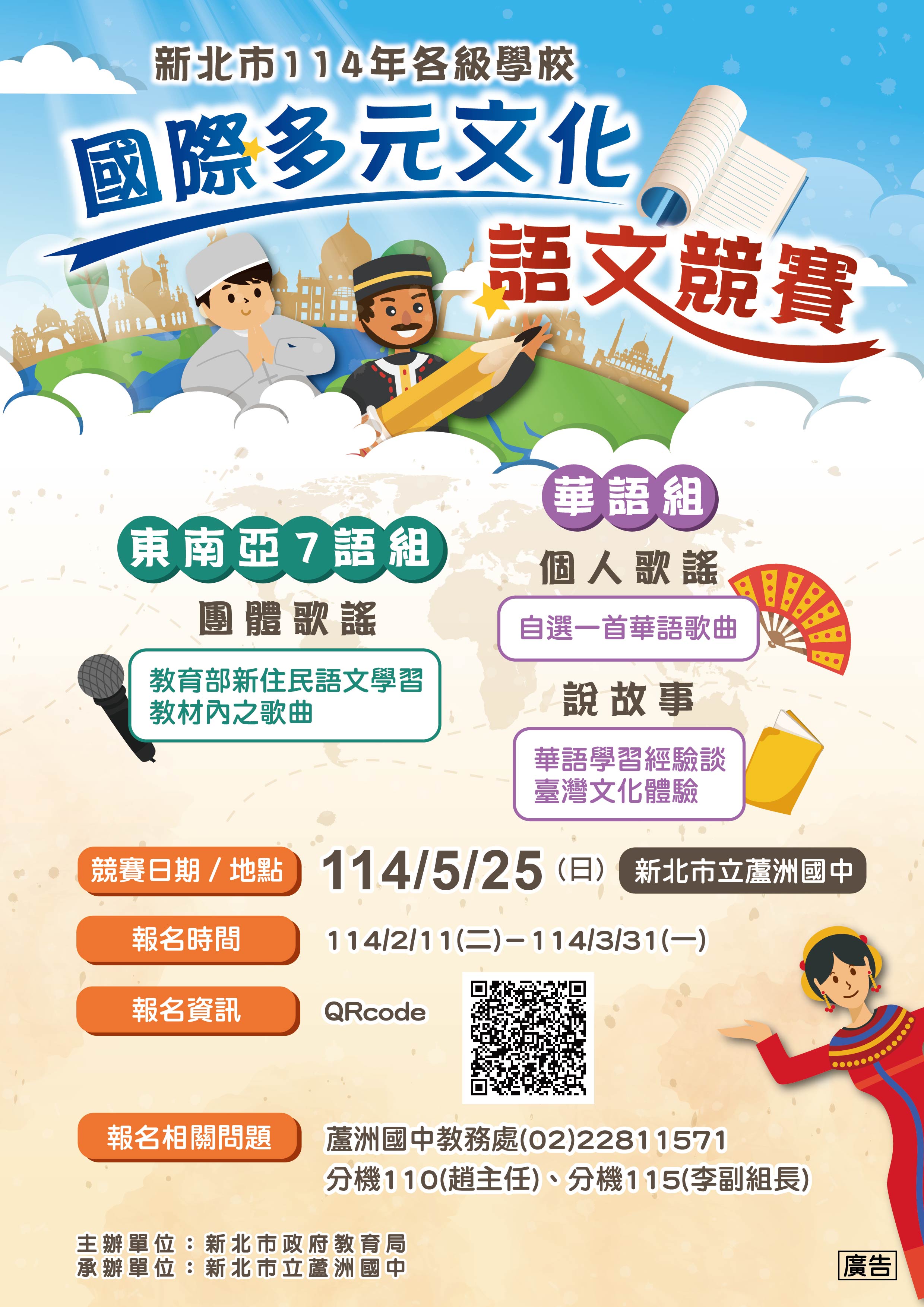 114年5月25日(星期日)舉辦「新北市114年各級學校國際多元文化語文競賽」。