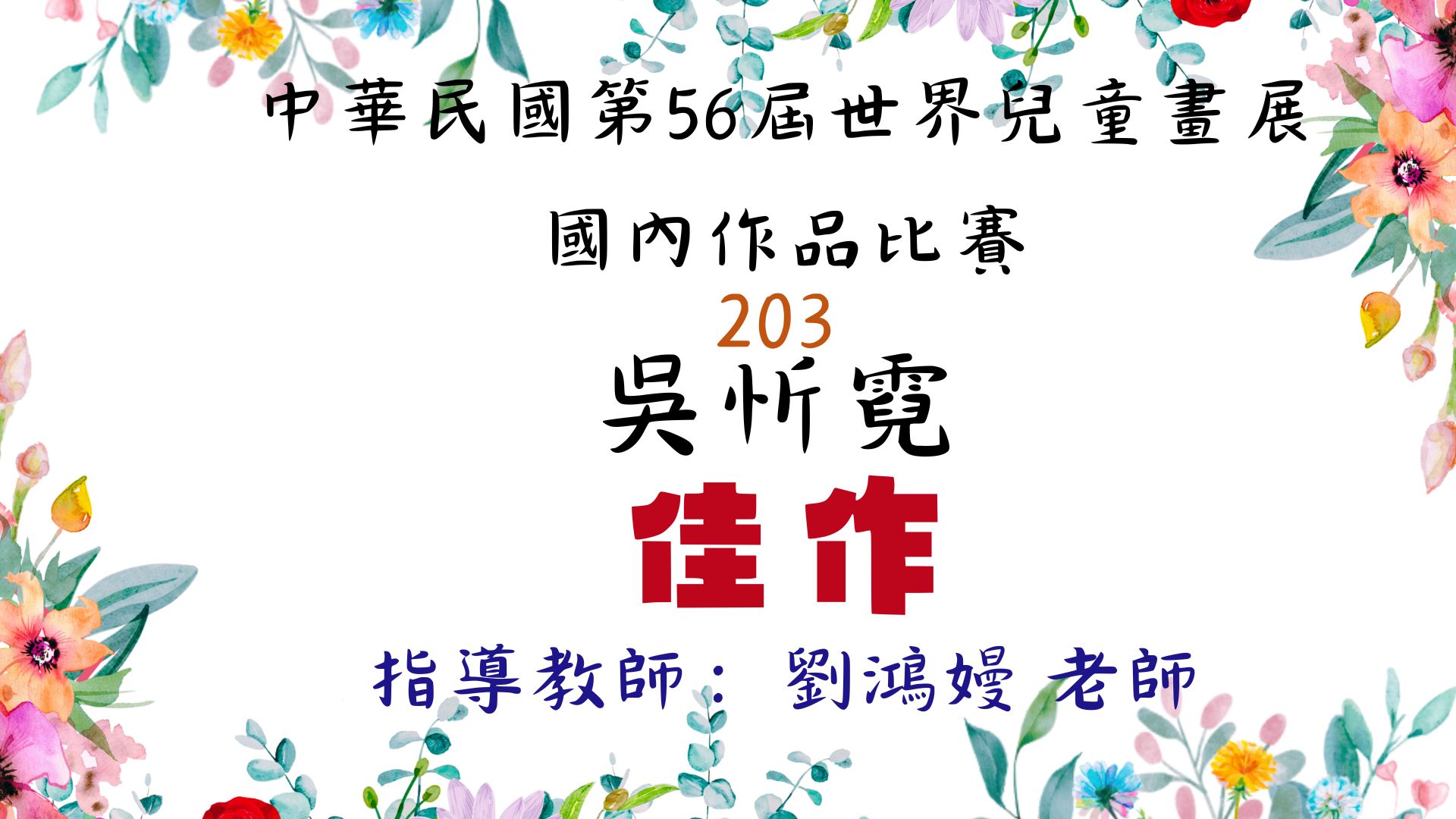 恭喜!203吳忻霓,獲「中華民國第56屆世界兒童畫展國內作品」比賽,佳作。