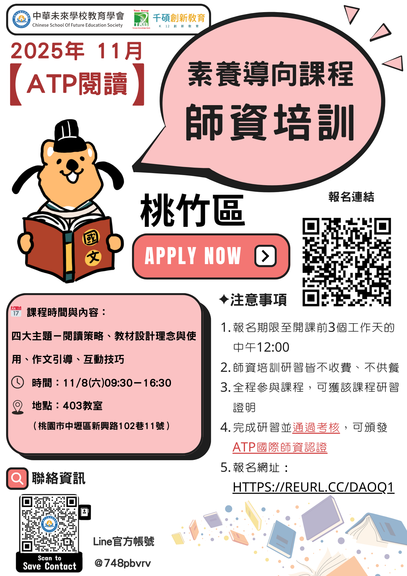 一、為提升教師素養導向教學能力,強化閱讀理解教學專業,本會特辦理「ATP素養導向閱讀師資培訓工作坊」。