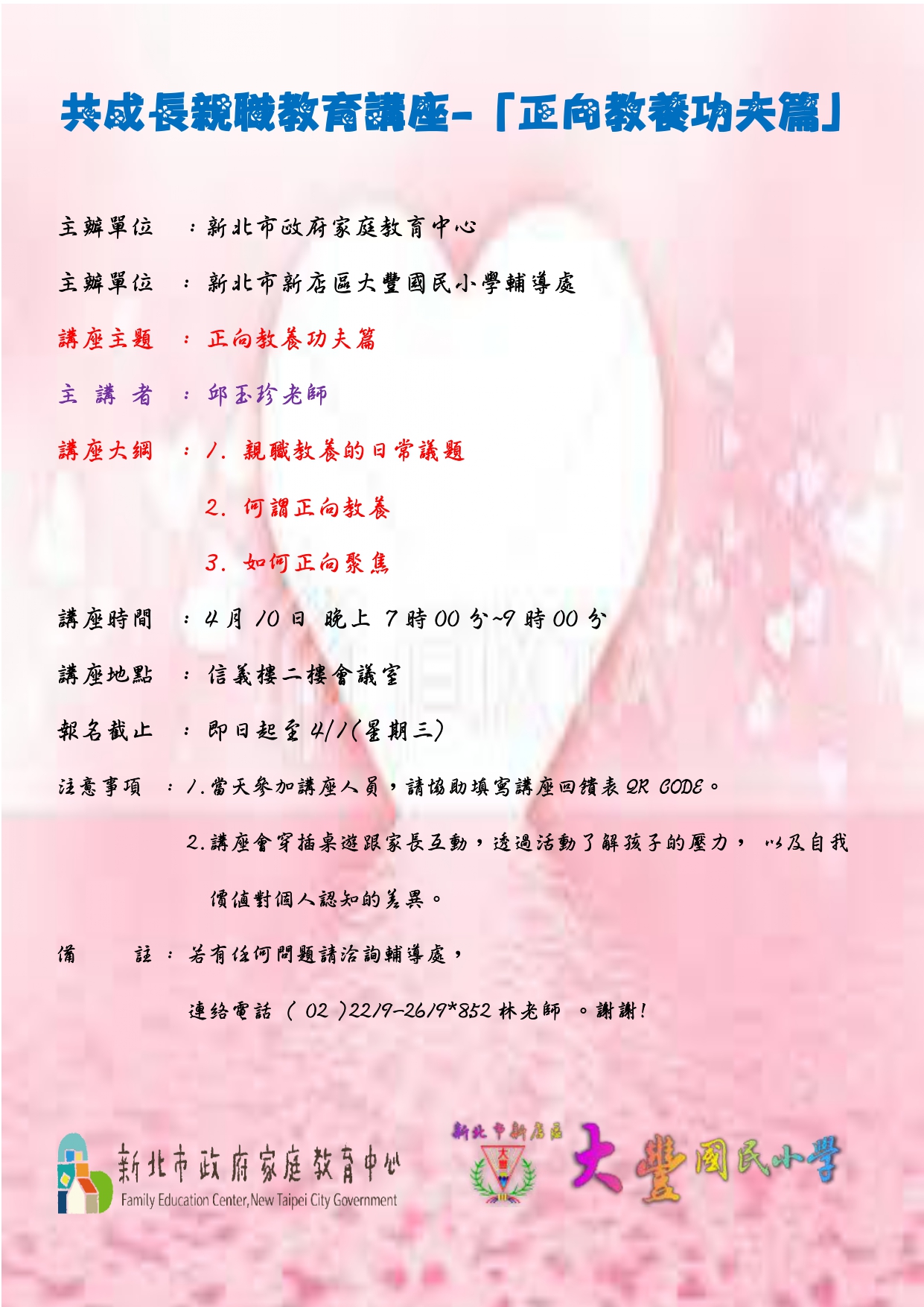 轉知 : 學校訂4/10(五) 晚上7:00~9:00於信義樓二樓會議室,辦理共成長親職教育講座 --- 「 正向教養功夫篇 」,歡迎家長踴躍報名參加。。(報名網址: https://forms.gle/a6YqC8CQ9earAZnr8)